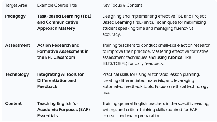 ESL/EFL Professional Development courses target specific areas to update English teachers’ pedagogical skills, content knowledge, and technological integration abilities.